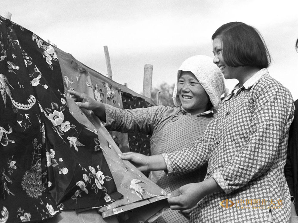 1955年10月13日,國(guó)營(yíng)上海第五印染廠工人帶著印花色布,向上海市江灣區(qū)市京村、自由村兩個(gè)農(nóng)業(yè)生產(chǎn)合作社的農(nóng)民征求意見(jiàn)。王朝楨 攝/新華社中國(guó)照片檔案館