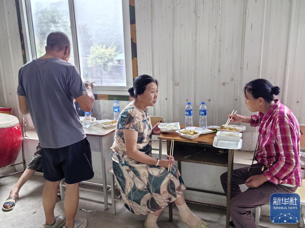 7月27日,在遼寧省鐵嶺縣大甸子鎮(zhèn),受災群眾在安置點吃飯?! ⌒氯A社發(fā)