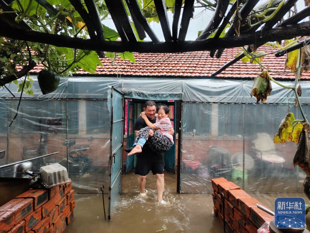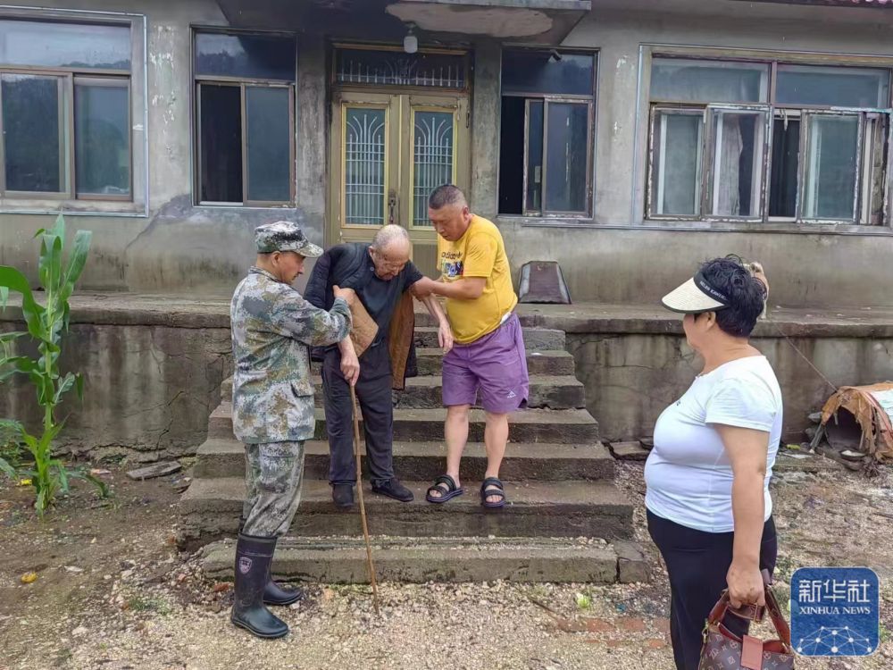 7月27日,在遼寧省鞍山市千山區(qū)老虎屯村,村干部在轉移受災群眾?! ⌒氯A社發(fā)