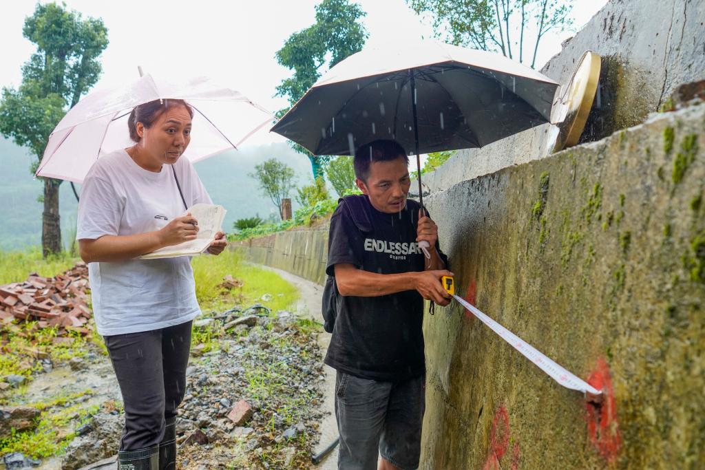 7月30日,富強村村黨支部書記謝小紅(左一)和地質(zhì)災(zāi)害監(jiān)測員魯業(yè)江(右一)一起對富強村一處地質(zhì)災(zāi)害點進行測量和監(jiān)測。新華社記者 劉潺 攝