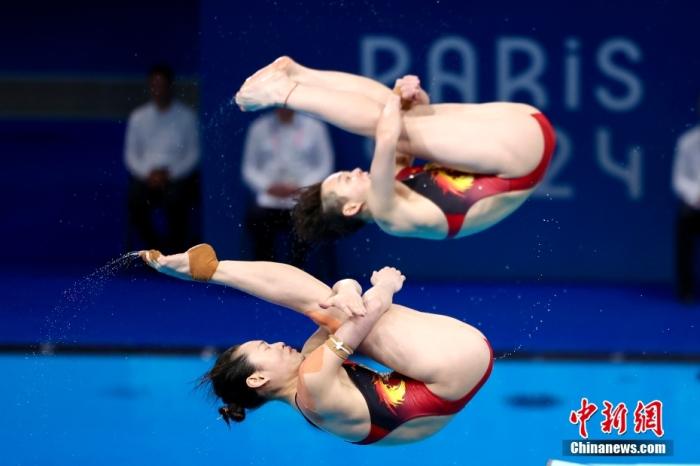 當(dāng)?shù)貢r(shí)間7月27日,中國(guó)組合昌雅妮(下)/陳藝文在比賽中。當(dāng)日,在巴黎奧運(yùn)會(huì)跳水女子雙人3米板決賽中,中國(guó)組合昌雅妮/陳藝文奪得金牌。 中新社記者 富田 攝