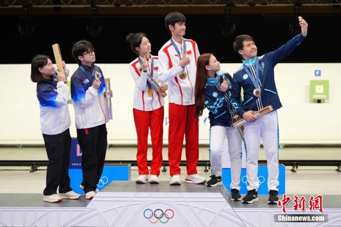 當(dāng)?shù)貢r(shí)間7月27日,在法國(guó)沙托魯舉行的巴黎奧運(yùn)會(huì)射擊10米氣步槍混合團(tuán)體決賽中,中國(guó)組合黃雨婷/盛李豪奪得金牌。這也是本屆巴黎奧運(yùn)會(huì)誕生的首枚金牌。圖為獲獎(jiǎng)選手在頒獎(jiǎng)儀式上自拍。中新社記者 趙文宇 攝