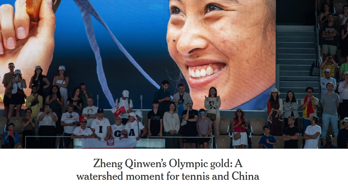 據(jù)美國(guó)《紐約時(shí)報(bào)》(NYTimes)當(dāng)?shù)貢r(shí)間4日在對(duì)中國(guó)網(wǎng)球選手鄭欽文的專(zhuān)題報(bào)道中寫(xiě)道,對(duì)于中國(guó)網(wǎng)球來(lái)說(shuō),這只是一個(gè)時(shí)間問(wèn)題,不是嗎?當(dāng)天凌晨,21歲的鄭欽文奪得巴黎奧運(yùn)會(huì)女子網(wǎng)球單打冠軍,為中國(guó)網(wǎng)球奪得了首枚奧運(yùn)女單金牌。