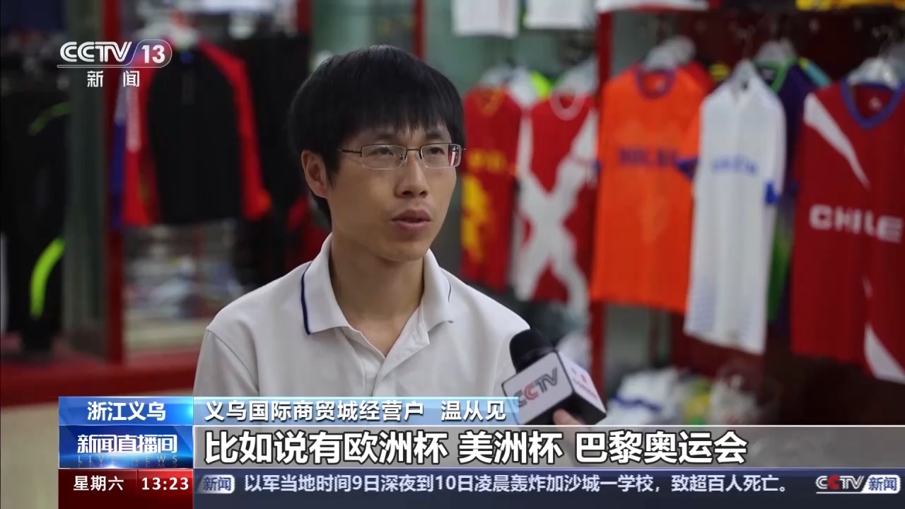義烏國際商貿(mào)城經(jīng)營戶 溫從見:今年因?yàn)槭鞘澜绱筚惸辏热缯f有歐洲杯、美洲杯、巴黎奧運(yùn)會(huì),差不多3月份開始,我們就已經(jīng)著手開始接單、打樣、生產(chǎn)這一系列的運(yùn)動(dòng)服飾。我們總共3個(gè)賽事下來銷了30萬件左右。