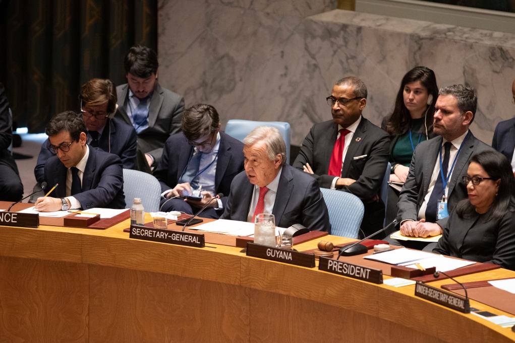 2月23日,在位于紐約的聯(lián)合國總部,聯(lián)合國秘書長古特雷斯(前排中)在烏克蘭問題高級(jí)別公開會(huì)上發(fā)言。烏克蘭危機(jī)升級(jí)兩周年之際,聯(lián)合國安理會(huì)23日舉行烏克蘭問題高級(jí)別公開會(huì),與會(huì)多方呼吁通過政治手段解決烏克蘭危機(jī)。新華社記者謝鍔攝