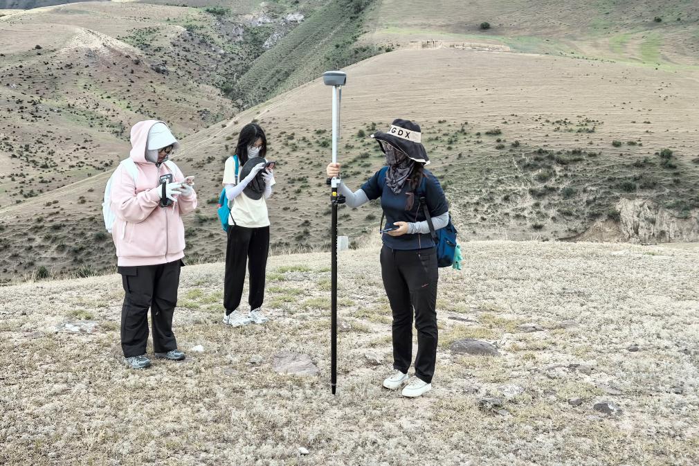 尼勒克縣第四次全國文物普查工作隊隊員魏中暢(左一)手持RTK測量儀,復核文物信息。新華社記者 白志強 攝