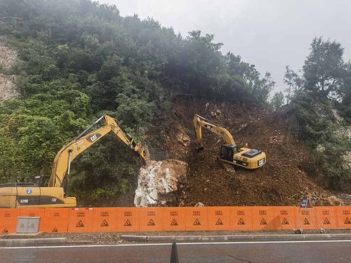 8月6日早7點10分左右,下解放村山上的巨石終于緩緩滑落到路面上。危險解除了,壓在干部群眾心頭的“巨石”,也終于落了地!