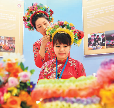 2月2日,兩名女孩在2024中國—東盟人文交流年展覽活動上展示福建蟳埔女頭飾。新華社記者 姜克紅攝