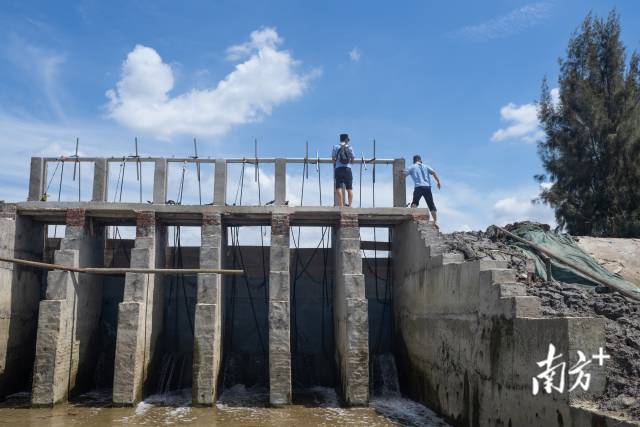 楊健宏與李明霖爬上水閘,查看紅樹林復種情況。