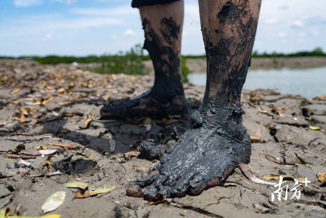 1個多月過去,補種的“樹寶寶”該做“體檢”了。日頭漸猛,潮漲起來了?!懊撔忂^去!”聽著楊健宏的招呼,大家一腳踏進泥地,一步一個腳印,泥土很快爬滿了小腿。