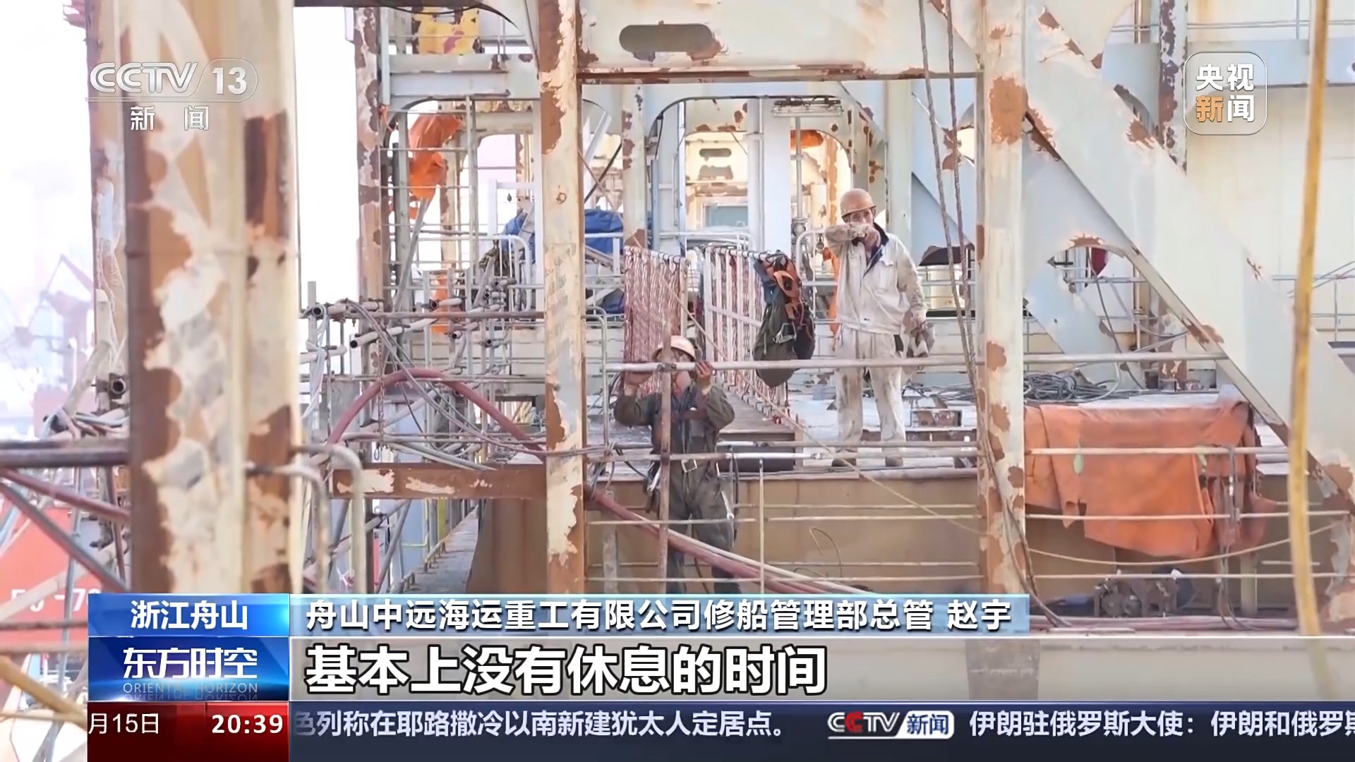 舟山中遠(yuǎn)海運(yùn)重工有限公司修船管理部總管 趙宇:到目前為止,我個(gè)人負(fù)責(zé)的船只,走一條來一條,基本上沒有休息的時(shí)間。對(duì)公司來說業(yè)務(wù)增加了、效益好了,那對(duì)我們個(gè)人來說,個(gè)人的錢包就鼓了。