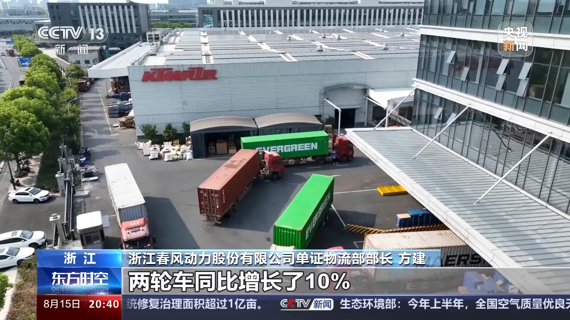 浙江春風(fēng)動(dòng)力股份有限公司單證物流部部長(zhǎng) 方建:上半年我們出口四輪車同比增長(zhǎng)了40%,兩輪車同比增長(zhǎng)了10%,然后集裝箱大概出運(yùn)了7700個(gè)大柜,同比增長(zhǎng)了27%。