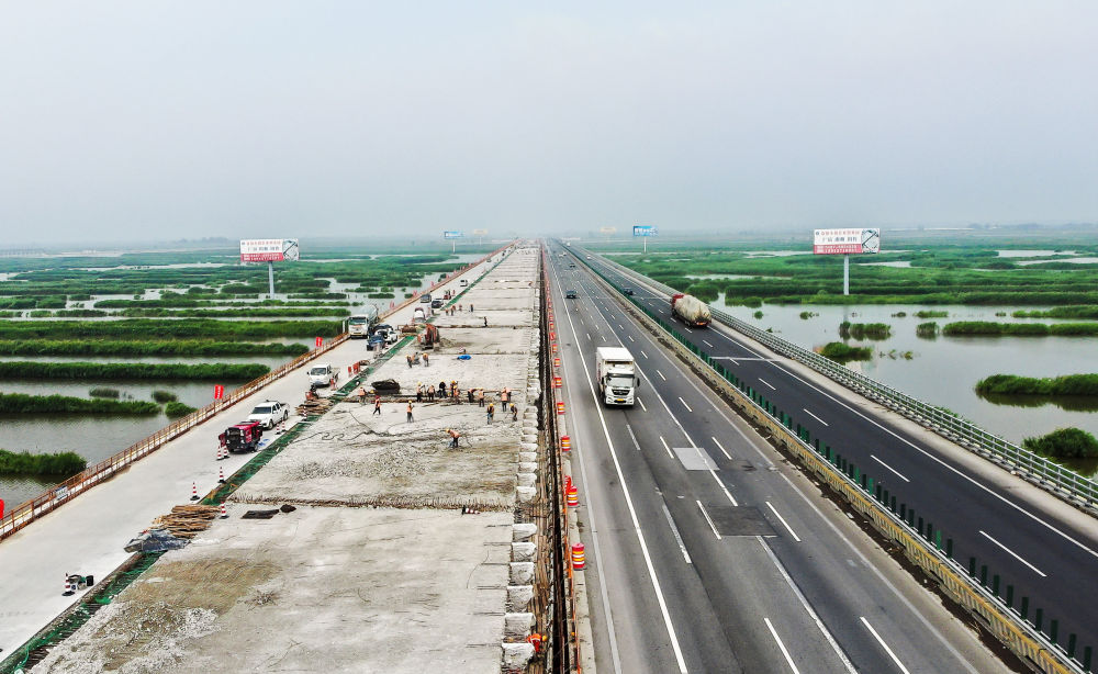 2024年7月4日,在京哈高速公路遼寧段改擴(kuò)建工程項(xiàng)目施工現(xiàn)場,中鐵四局建設(shè)者進(jìn)行橋面施工作業(yè)(無人機(jī)照片)。新華社記者 楊青 攝