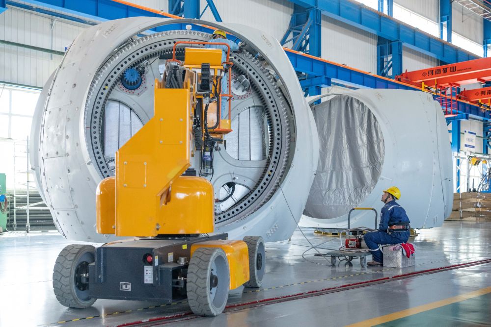 2024年4月28日,工人在位于黑龍江省齊齊哈爾市的中國一重集團(tuán)有限公司風(fēng)電設(shè)備裝配車間加工風(fēng)電輪轂。新華社記者 謝劍飛 攝