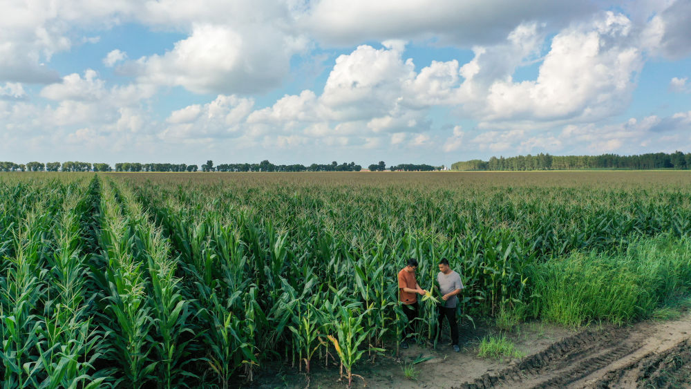 2024年8月8日,在吉林省梨樹縣孤家子鎮(zhèn)兩家子村,當(dāng)?shù)剞r(nóng)業(yè)發(fā)展服務(wù)站高級(jí)農(nóng)藝師蘭雨壯(左)與四平市強(qiáng)盛農(nóng)機(jī)農(nóng)民專業(yè)合作社負(fù)責(zé)人查看玉米長勢(shì)(無人機(jī)照片)。多年來,地處世界“黃金玉米帶”的全國產(chǎn)糧大縣吉林省梨樹縣,強(qiáng)化科技在農(nóng)業(yè)生產(chǎn)中的支撐作用,持續(xù)提升糧食和重要農(nóng)產(chǎn)品穩(wěn)產(chǎn)保供能力。