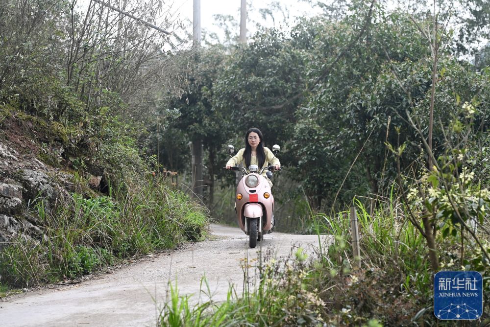在廣西灌陽縣洞井瑤族鄉(xiāng)野豬殿村,“95后”老師趙艷騎著電動自行車從學?;丶遥?024年3月27日攝)。