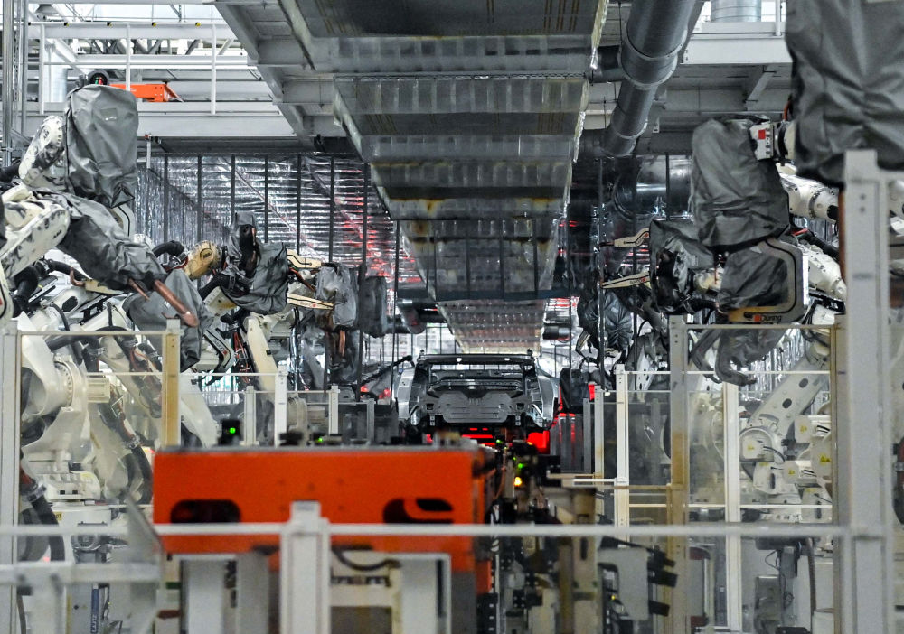 8月5日,在位于吉林省長春市一汽紅旗制造中心繁榮廠區(qū)的焊裝車間內(nèi),焊裝機器人在生產(chǎn)線上焊接車身。新華社記者 顏麟蘊 攝