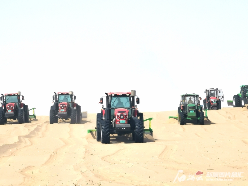 排成一排的拖拉機(jī)正在平整沙地。石榴云/新疆日?qǐng)?bào)記者 曹華攝