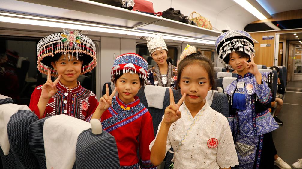 金秋九月,云南寧洱哈尼族彝族自治縣的青少年宣講團,在中老鐵路寧洱至昆明路段宣講民族團結(jié)誓詞碑故事。