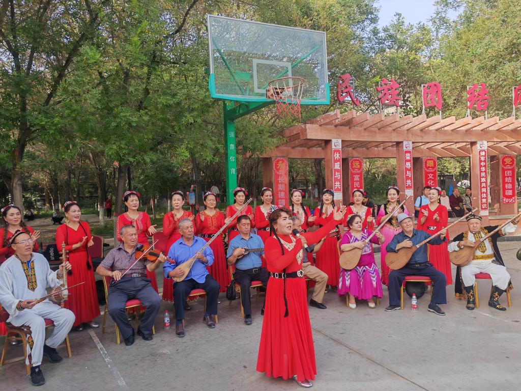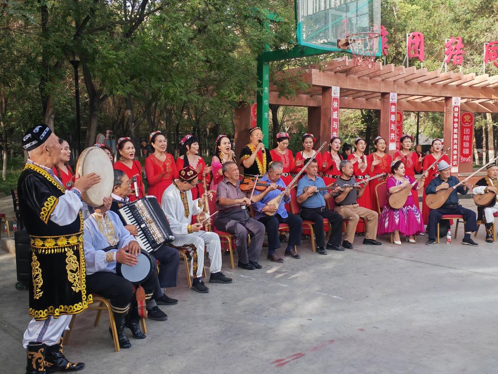 9月19日,庫(kù)爾勒市朝陽(yáng)街道團(tuán)結(jié)社區(qū)“石榴籽藝術(shù)團(tuán)”團(tuán)長(zhǎng)卡得爾·克衣木正帶著團(tuán)員們?yōu)榫用癖硌?。新華社記者顧煜 攝