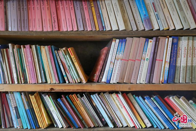 扎西達(dá)杰介紹藏書。中國網(wǎng)記者鄭偉攝