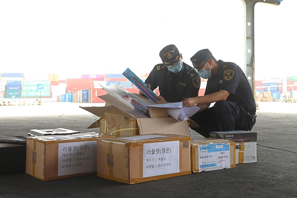 廣州海關所屬南沙海關關員對第136屆廣交會進口展品進行監(jiān)管。(麥東豪攝)