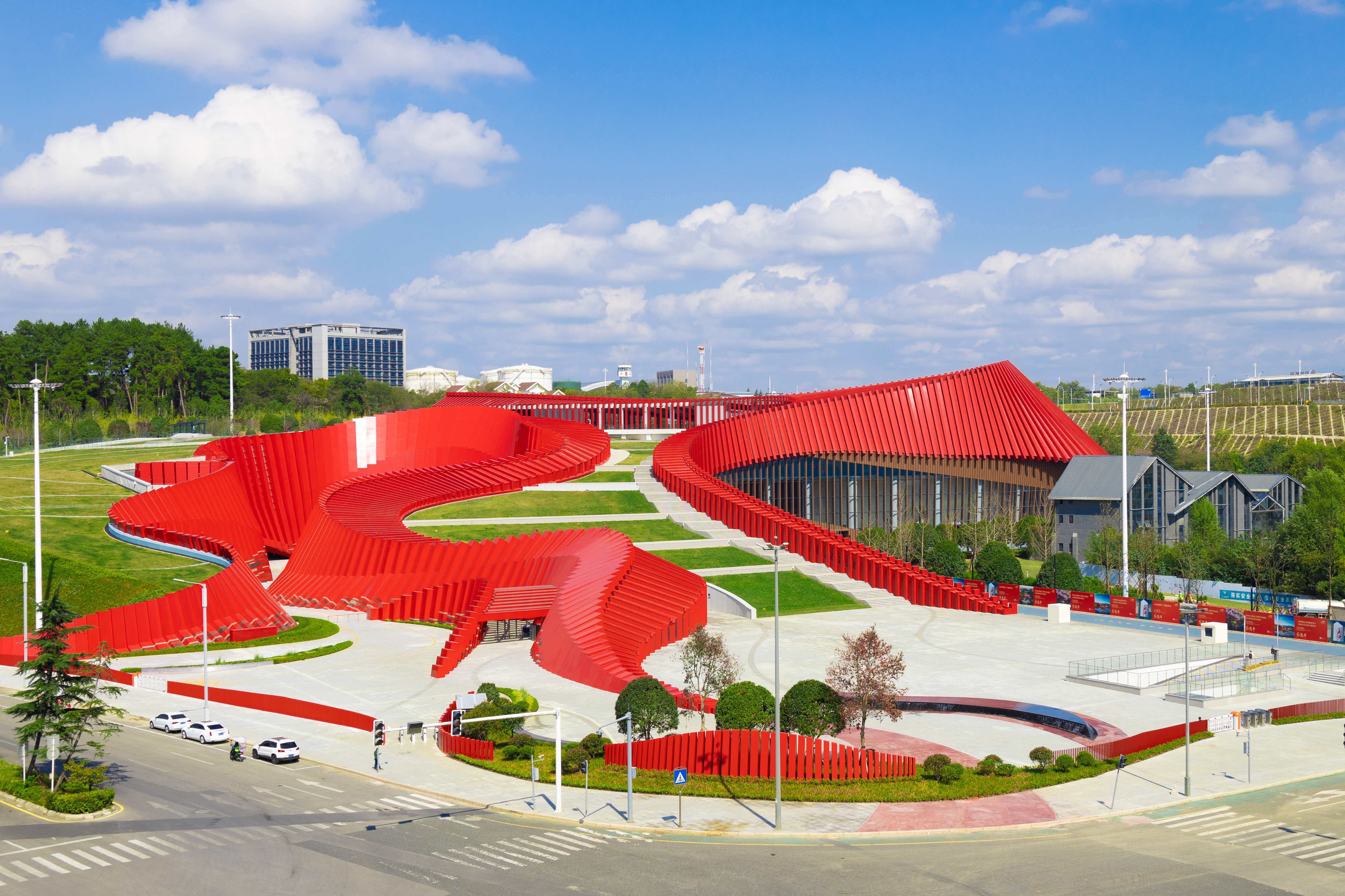 乘坐航班前往貴陽(yáng)的游客,若在貴陽(yáng)龍洞堡機(jī)場(chǎng)上空俯瞰,可發(fā)現(xiàn)有一座巨型建筑鋪展在青山綠水之間。它由一塊塊紅色的曲面幕墻構(gòu)成,此起彼伏,形成了連續(xù)轉(zhuǎn)折的動(dòng)態(tài)輪廓,猶如一條靈動(dòng)的“紅飄帶”。它就是全國(guó)首個(gè)以長(zhǎng)征為主題的全域沉浸式數(shù)字科技體驗(yàn)館,也是長(zhǎng)征國(guó)家文化公園貴州重點(diǎn)建設(shè)區(qū)的標(biāo)志性、引領(lǐng)性工程。