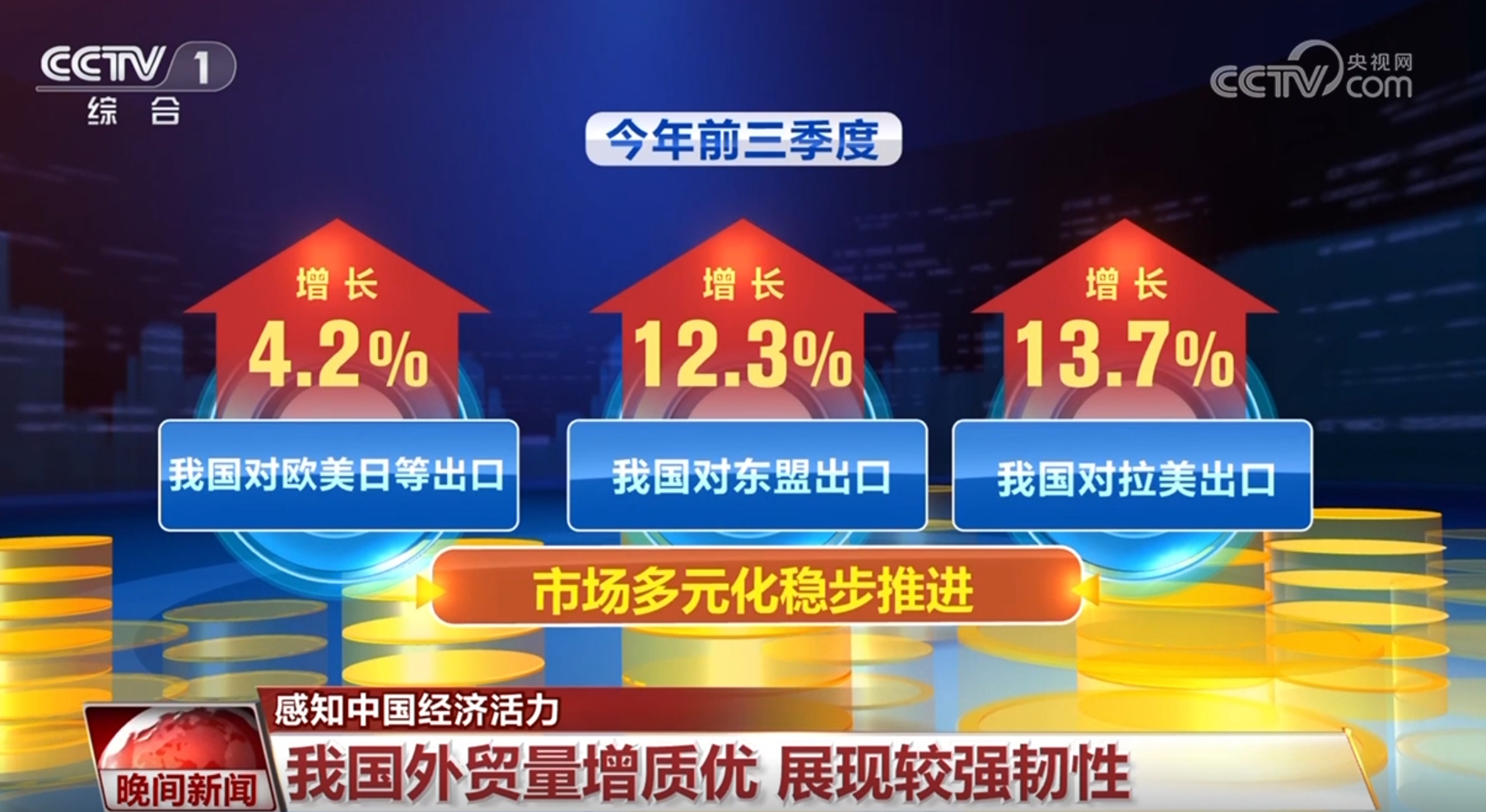 今年以來,我國外貿(mào)量增質(zhì)優(yōu),展現(xiàn)較強(qiáng)韌性。世貿(mào)組織最新數(shù)據(jù)顯示:上半年我國出口國際市場份額為14.3%,同比提高0.4個(gè)百分點(diǎn)。前三季度,我國與160多個(gè)國家和地區(qū)貿(mào)易實(shí)現(xiàn)增長,對(duì)歐美日等傳統(tǒng)市場出口增長了4.2%,對(duì)東盟、拉美等新興市場出口分別增長了12.3%和13.7%,市場多元化穩(wěn)步推進(jìn)。在深圳鹽田港,僅今年前9個(gè)月就新增了16條航線。