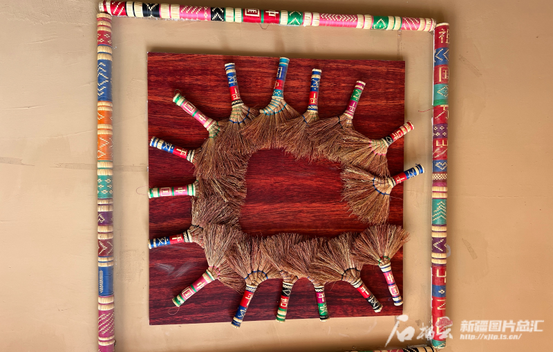 疏附縣托克扎克鎮(zhèn)阿亞格曼干村手工掃把工藝坊里,村民依巴古麗·阿布都克然用掃把做的旅游紀(jì)念品。石榴云/新疆日?qǐng)?bào)記者 拍熱扎提·阿不都攝