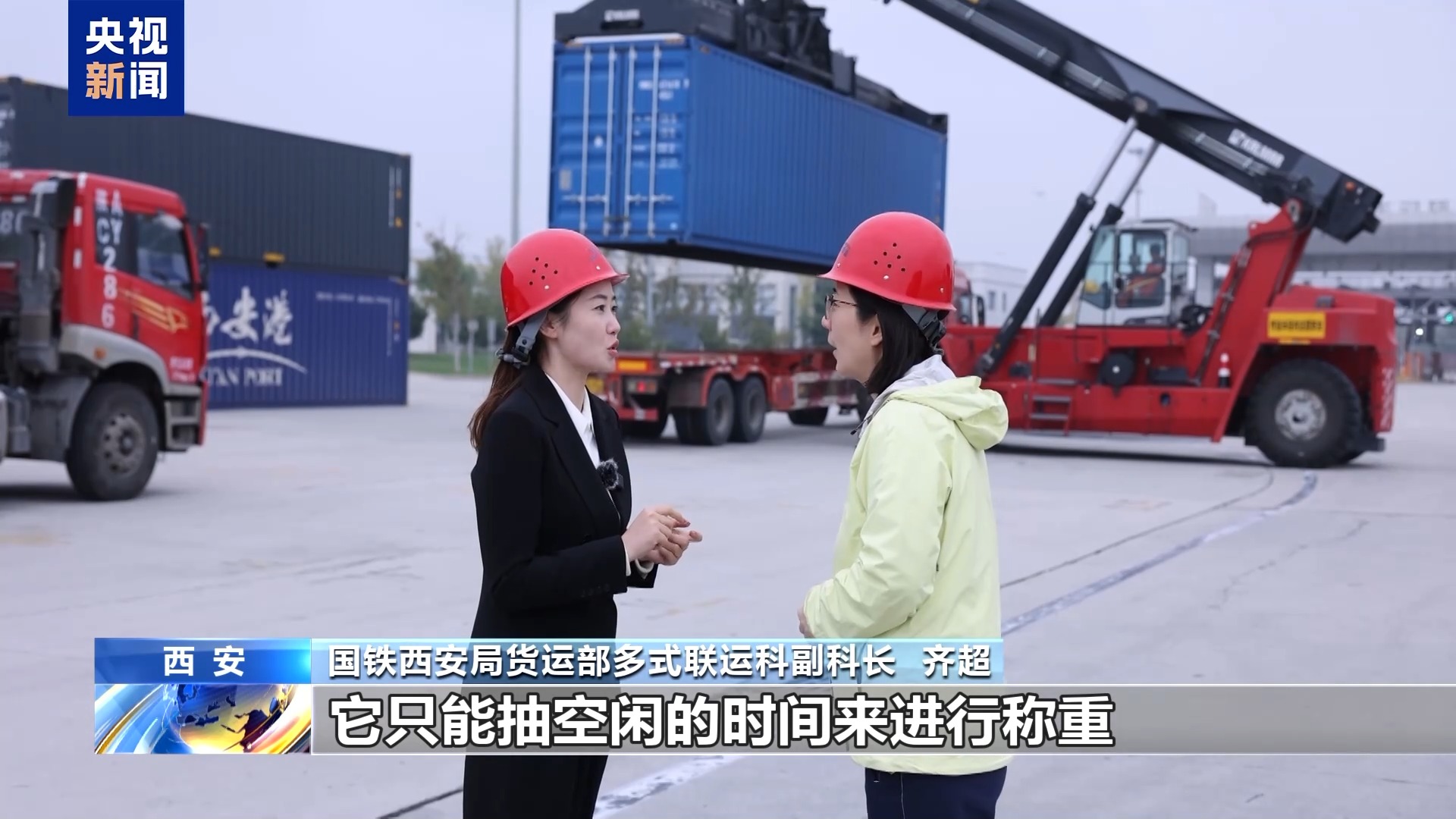 國鐵西安局貨運(yùn)部多式聯(lián)運(yùn)科副科長 齊超:因?yàn)辇堥T吊的主要任務(wù)是為了裝卸火車,只能抽空閑的時間進(jìn)行稱重,所以集卡司機(jī)等待的時間非常長,而且沒有確定性,也不知道什么時候能稱到自己。