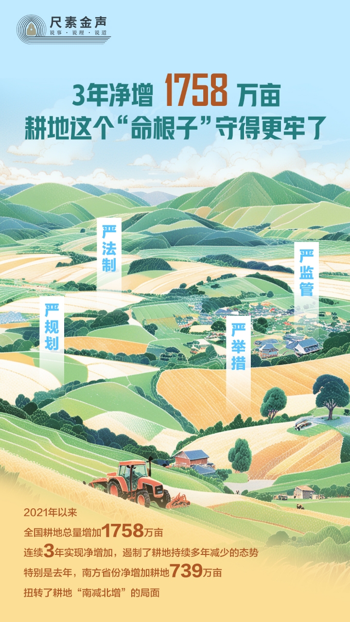 自然資源部日前發(fā)布數(shù)據(jù)顯示:2021年以來,全國耕地總量增加1758萬畝,連續(xù)3年實現(xiàn)凈增加,遏制了耕地持續(xù)多年減少的態(tài)勢。特別是去年,南方省份凈增加耕地739萬畝,扭轉了耕地“南減北增”的局面。