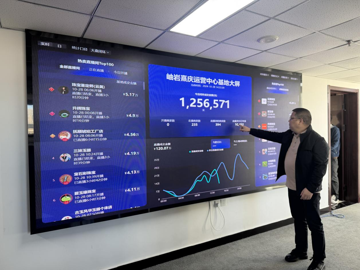 “1256571元,這是我們一上午的交易額”,岫巖熹慶運營中心的負責人指著墻上的大屏幕說:“通過這塊屏幕,不僅能實時看到各家商戶的開播、交易情況,還可以通過數(shù)據(jù)的波動及時發(fā)現(xiàn)存在的問題?!?/p>