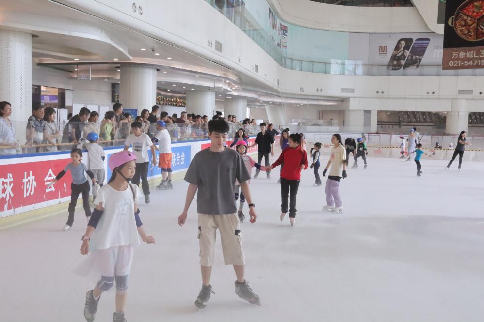 位于上海市閔行區(qū)的華潤上海萬象城冰場,今年暑假日均接待量超過340人次,其中約80%是前來訓練的青少年學員。上海市民王蓓的女兒長期在此訓練,商圈餐飲、游樂、電影院、書店、購物等業(yè)態(tài)齊全,女兒滑冰訓練結(jié)束后,一家人在此休閑一整天。