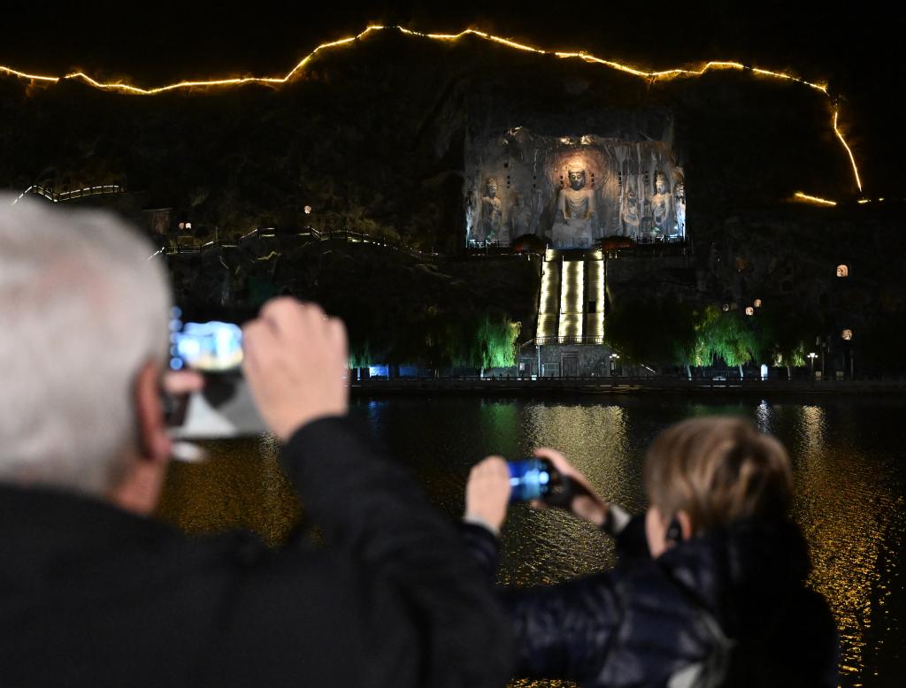 11月4日,外賓在河南省洛陽市龍門石窟景區(qū)禮佛臺拍照留念。新華社記者 李嘉南 攝