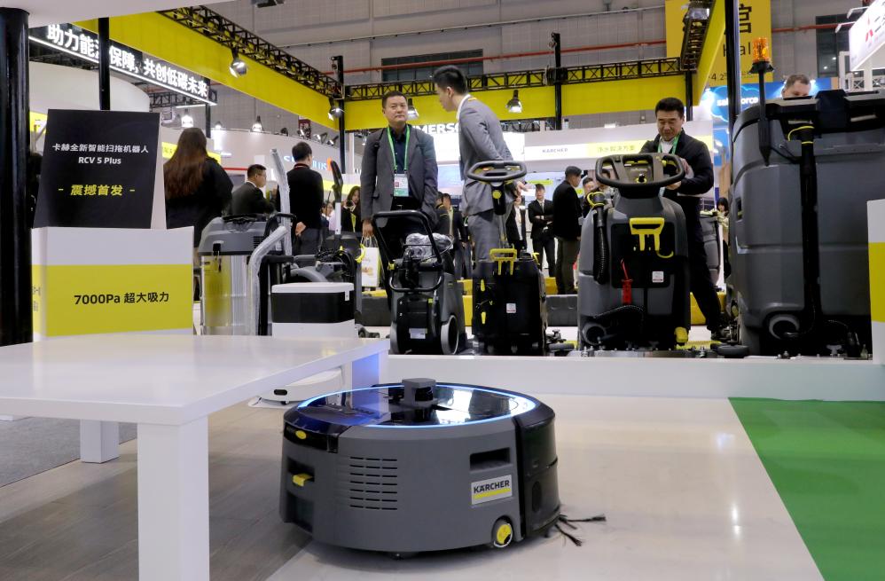 11月6日,一臺(tái)卡赫全新智能掃拖機(jī)器人RCV 5 Plus(前)在進(jìn)行作業(yè)演示。這是該產(chǎn)品在進(jìn)博會(huì)上的首展首發(fā)。新華社記者 方喆 攝