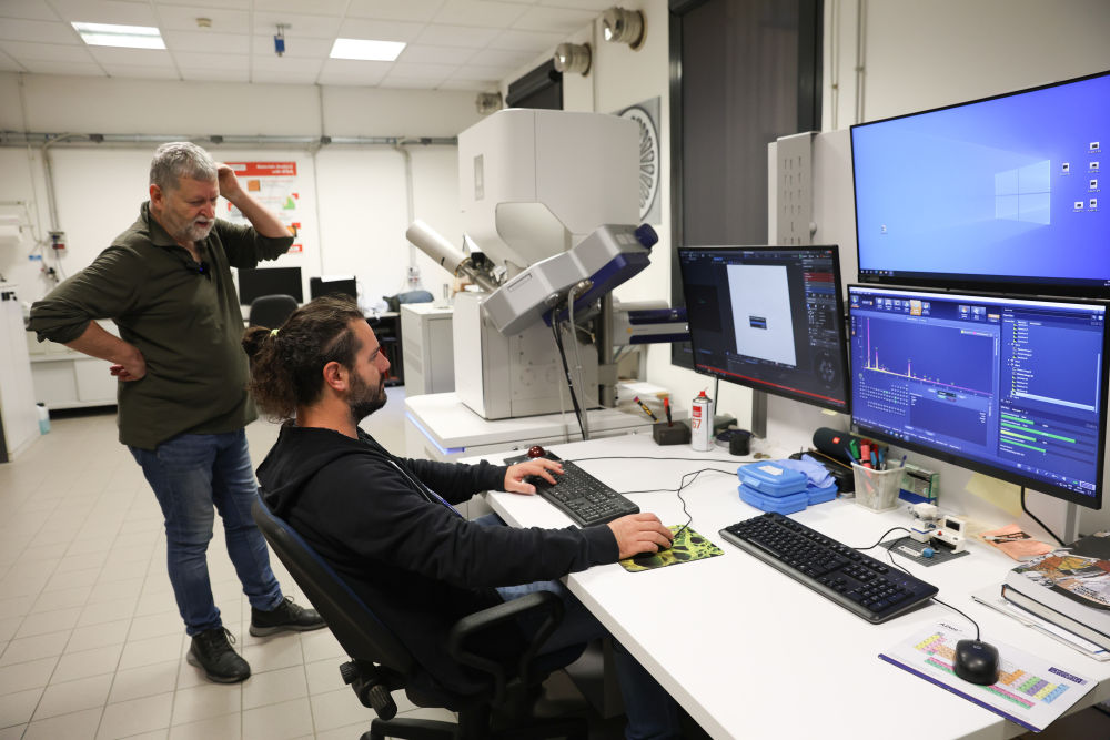 11月6日,意大利帕多瓦大學(xué)文化遺產(chǎn)學(xué)院教授馬西莫·維達(dá)萊(左)與研究人員在實(shí)驗(yàn)室討論青銅獅樣本檢測分析過程。新華社記者李京攝