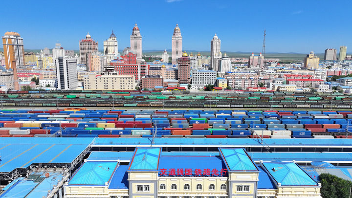 2024年8月20日,出境的中歐班列在中國(guó)鐵路哈爾濱局集團(tuán)有限公司內(nèi)蒙古滿洲里站內(nèi)整裝待發(fā)(無(wú)人機(jī)照片)。新華社發(fā)(黃旭 攝)