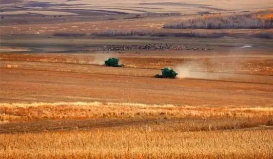 ▲ 大型收割機在進(jìn)行收割。莫旗融媒體供圖