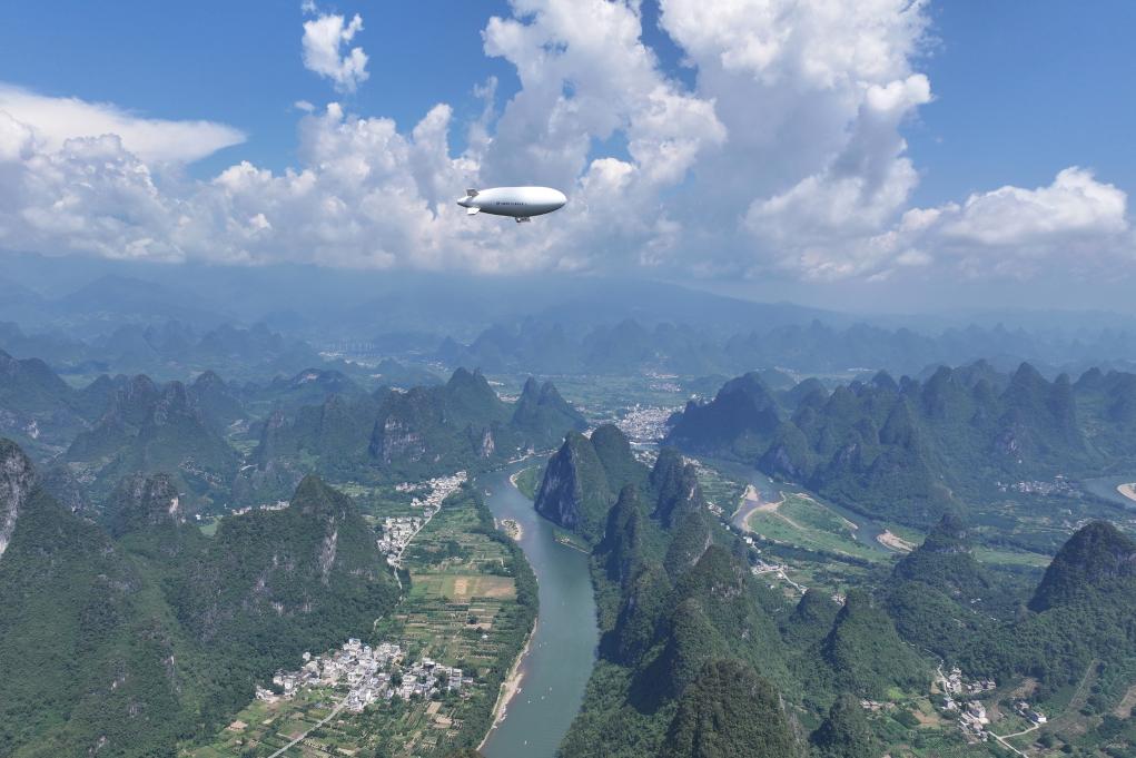 9月14日,“祥云”AS700載人飛艇在廣西陽朔進行演示飛行(無人機照片)。新華社發(fā)(中國航空工業(yè)集團特種飛行器研究所供圖)