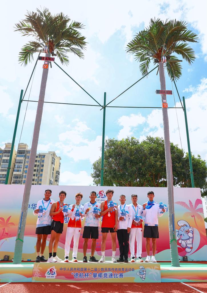 11月24日,獲獎選手在頒獎儀式上合影。當日,第十二屆全國少數(shù)民族傳統(tǒng)體育運動會攀椰競速男子9米決賽在西南大學(xué)三亞中學(xué)體育場舉行。新華社記者 楊植森 攝