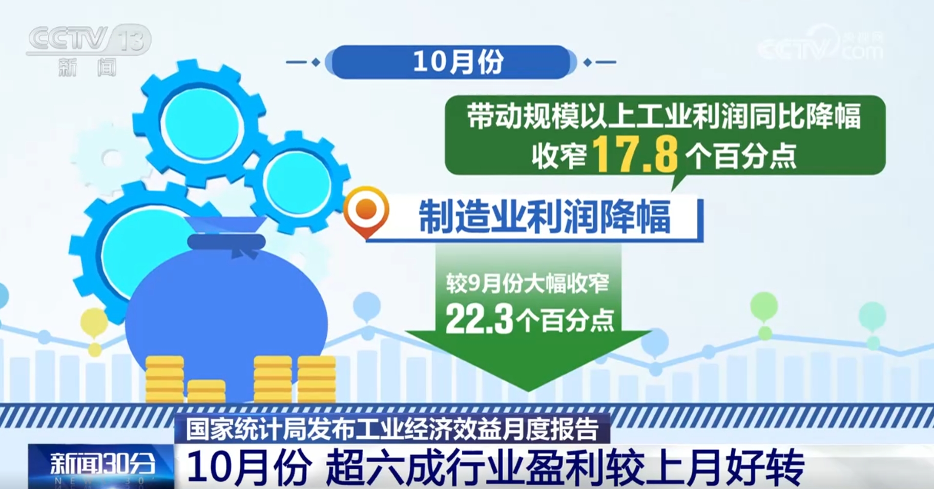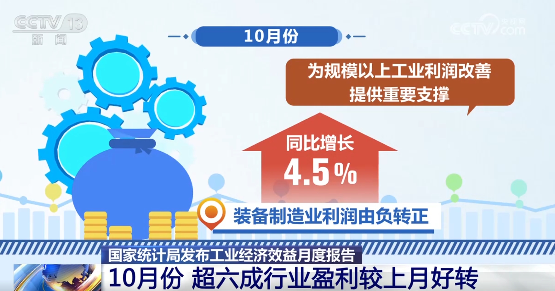 國(guó)家統(tǒng)計(jì)局最新發(fā)布的數(shù)據(jù)顯示,10月份,隨著存量政策及一攬子增量政策協(xié)同發(fā)力、持續(xù)顯效,規(guī)模以上工業(yè)企業(yè)生產(chǎn)穩(wěn)定增長(zhǎng),企業(yè)利潤(rùn)當(dāng)月降幅明顯收窄,多數(shù)行業(yè)盈利較上月好轉(zhuǎn)。