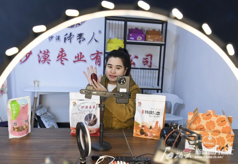 11月29日,策勒縣智慧果業(yè)農(nóng)民專業(yè)合作社員工在直播銷售大棗。