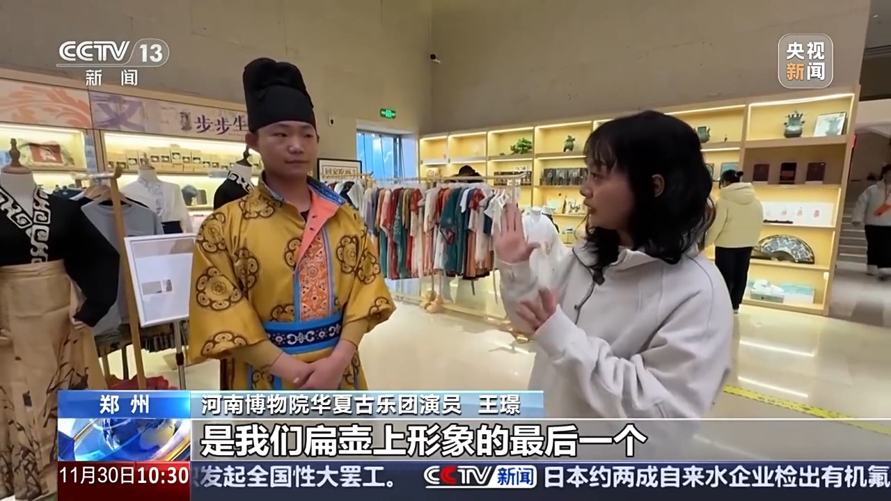 河南博物院華夏古樂團演員 王璟:我們也是依據(jù)一些文獻記載,比如說我們有一個動作是提臀動胯,是當時的一個胡人的舞蹈形象。還有揚眉動目是我們扁壺上形象的最后一個。