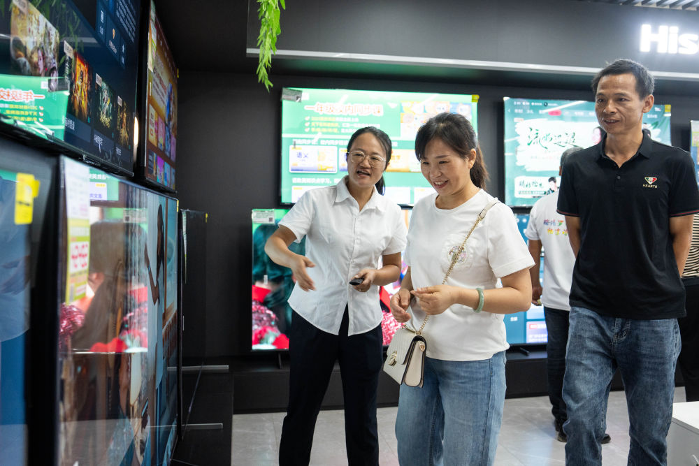 9月24日,彭坤(右一)和妻子彭建華(中)在汨羅市天虹電器城挑選電視。