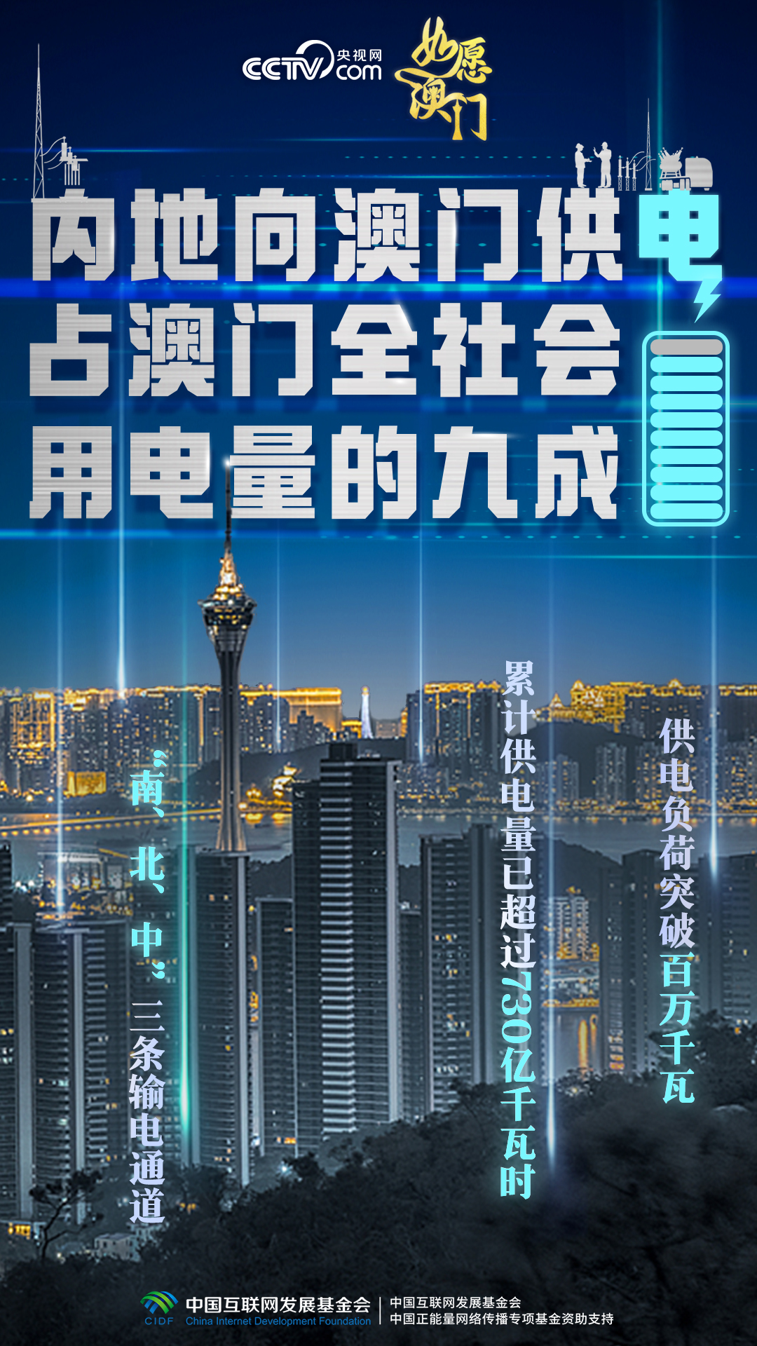 澳門缺電,南海油氣田里伸出專供澳門發(fā)電的天然氣管道,粵澳“南、北、中”三條輸電通道接續(xù)架設(shè),條條“銀線”相連,為澳門經(jīng)濟社會發(fā)展注入源源不斷的強勁動能。1999年回歸當年,內(nèi)地對澳供電量為1.95億千瓦時;2024年7月,內(nèi)地向澳門供電負荷突破百萬千瓦,累計供電量已超過730億千瓦時。