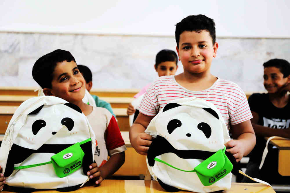 7月11日,在伊拉克巴格達(dá),即將搬遷至振華希望學(xué)校就讀的當(dāng)?shù)貙W(xué)生收到振華石油贈(zèng)送的書包。新華社發(fā)
