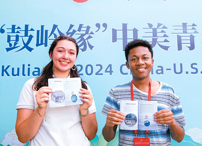 參加2024“鼓嶺緣”中美青年交流周活動的兩名學生代表展示在鼓嶺“打卡”“蓋章”。新華社記者 魏培全攝