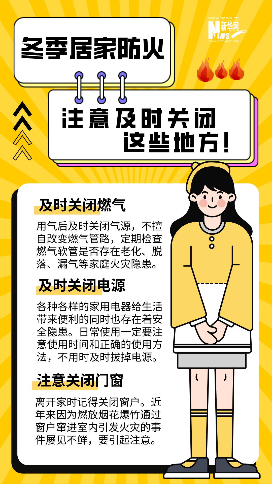 男子在家中用火盆取暖時,不慎引燃身上衣物;女子在電暖器上晾衣服引發(fā)火災(zāi);母子二人因在家中燒煤取暖、通風(fēng)不暢導(dǎo)致一氧化碳中毒......冬季天氣寒冷干燥,晝夜溫差大,生活用火、用氣、用電增加。若疏忽大意,極易引發(fā)火災(zāi)。安全過冬,居家防火這些細(xì)節(jié)要注意。