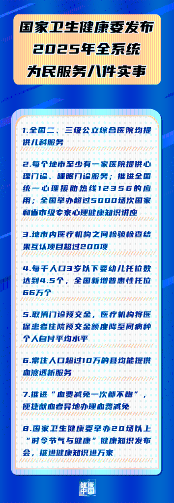 國(guó)家衛(wèi)生健康委31日發(fā)布2025年全系統(tǒng)為民服務(wù)八件實(shí)事,包括: