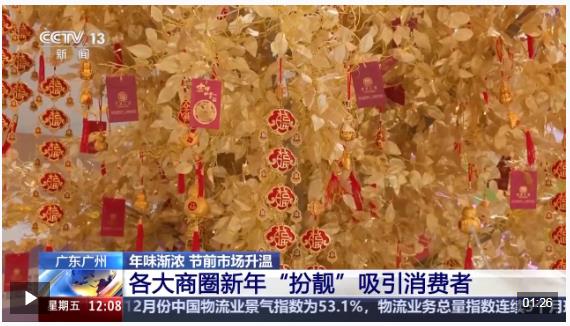 在廣州各大商圈,歡喜過大年的喜慶裝扮陸續(xù)煥新,有的擺上紅紅火火的“金錢樹”,有的在商場內設立各種展覽,增加消費者購物樂趣和文化體驗?! ?